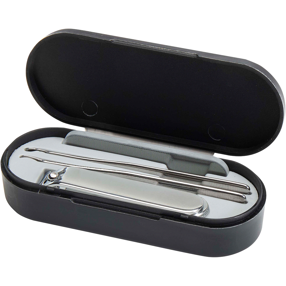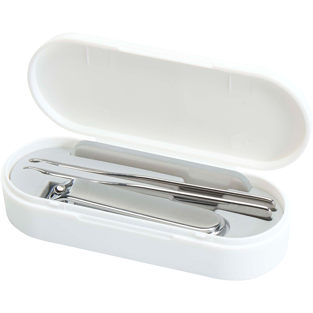 Includes 4 essential tools: Smooth glass nail file Durable nail clippers Precision cuticle stick Ear spoon Compact and portable ideal for home or travel Designed for well-groomed nails and detailed care Versatile grooming for everyday use. Materials: 45% Recycled PET Plastic and 35% Rubber, 10% Carbon steel and 5% Stainless Steel, 5% Glass. Price includes: NI Printshop - Digital Print Per Position. NI Printshop - Digital Print Per Position. Setup is included.
