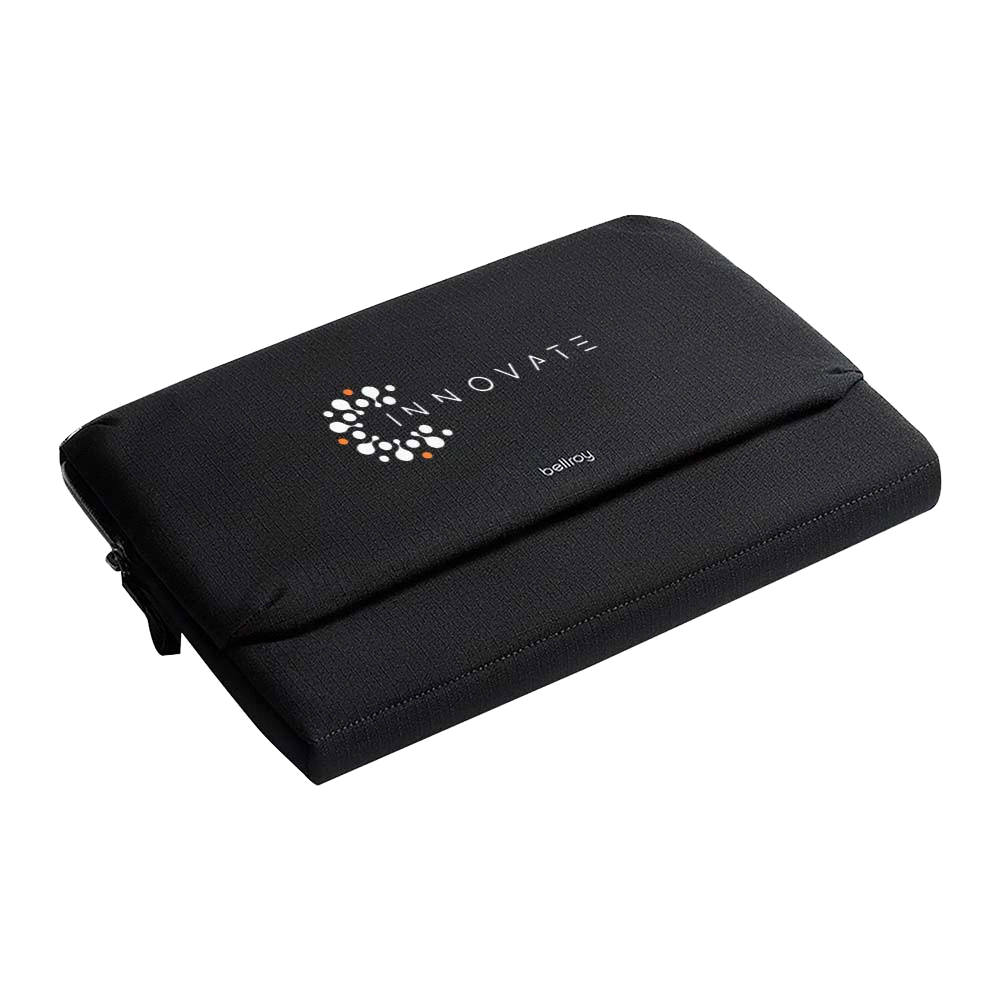 Eco Friendly Product. The Bellroy 16 Laptop Caddy is an all-in-one officemate that keeps your key work tools neatly stowed and easy to access, from bag to desk to meeting room table. The roomy zippered main compartment features a foam-padded laptop sleeve that fits laptops up to 16. The inside of the caddy includes a fold-down front pocket access, two stretch mesh storage pockets, two mesh pen slips and additional storage space for bulky items. Made with water-resistant zip and fabric, and includes soft-touch interior lining.