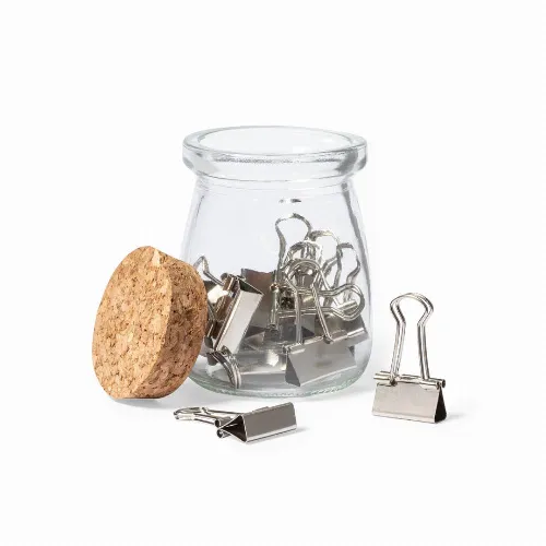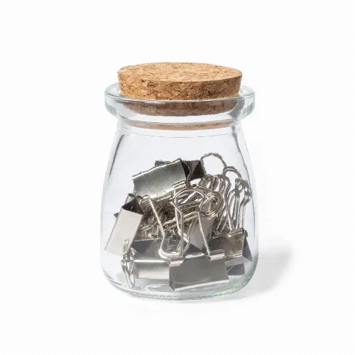 Clip holder made of resistant transparent glass, with original vintage design and natural cork lid.