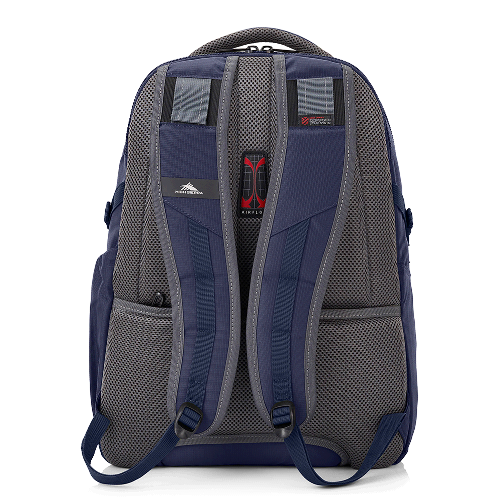 Padded 17" laptop compartment with safety hammock Tablet pocket AirFlow back panel with suspension straps Premium metal carabiner Rain cover included Trolley sleeve with hidden RFID pocket Multiple hanging loops Side bottle pocket Reflective strip for night time safety. Packaging: Bulk. Materials: Polyester