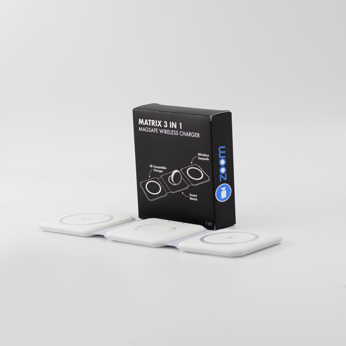 Power up without the cable chaos. The Matrix 3-in-1 MagSafe Wireless Charger keeps your phone, earbuds and smartwatch juiced up all at once, no juggling required. Fold it down for travel, flip it out on your desk and let the magnetic magic do the rest. With a smooth ABS and silicon finish and fast-charging options up to 15W, it s a clever bit of kit that pulls its weight. Presented in a black box with logo. Packaging: Black Box Colour: White. Price includes: 10 Days Service. Sticker. Setup is included.