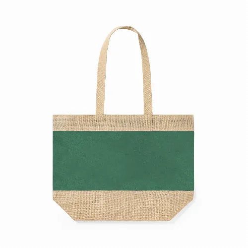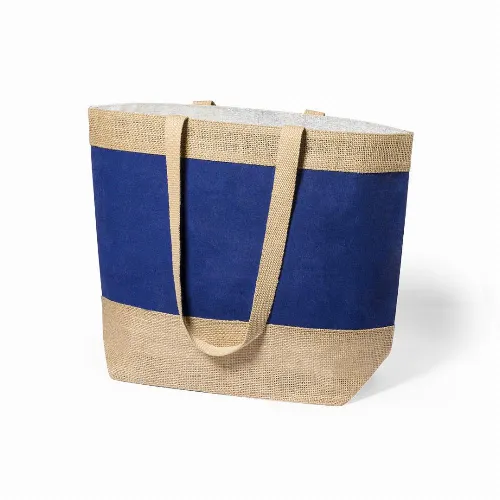 Bag in durable combination of laminated jute and laminated cotton, with natural cotton handles.