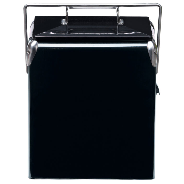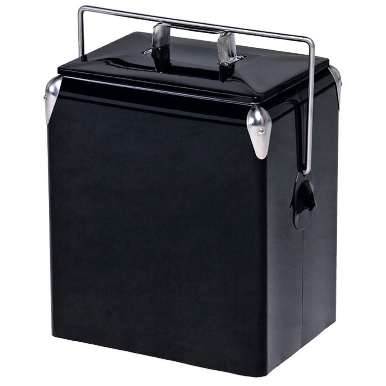 Iron sheet outer with powder coated gloss finish. Food grade PP plastic leak-proof insulated liner for easy cleaning. Shiny chrome details. Integrated bottle opener. Holds 6 wine bottles standing up. Chrome locking bar carry handle. Capacity:17 Litres. Dimensions:32cm W x 43cm H x 23.5cm D. Decoration Area:POA Size on request. Colour: Black. Freight Details:1 per carton, 4.8kg, 37cm L x 47.5cm W x 28.5cm H