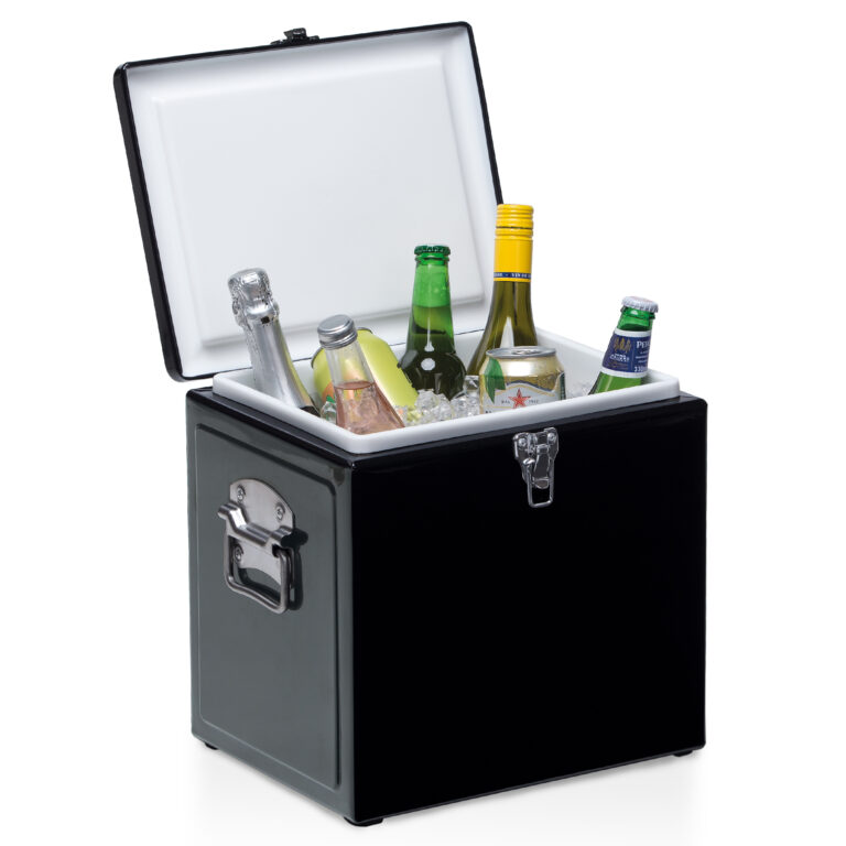 Iron sheet outer with powder coated gloss finish. Food grade PP plastic leak-proof insulated liner. Shiny chrome details. Retains ice for up to 48 Hours. Riveted industrial side carry handles. Double metal barrel hinged lid. Metal latched front closure. Capacity:15 Litres. Dimensions: 32.5cm W x 31cm H x 25cm D. Decoration area:Front: Size on request, Top: 60mm W x 40mm H Pad/Laser.