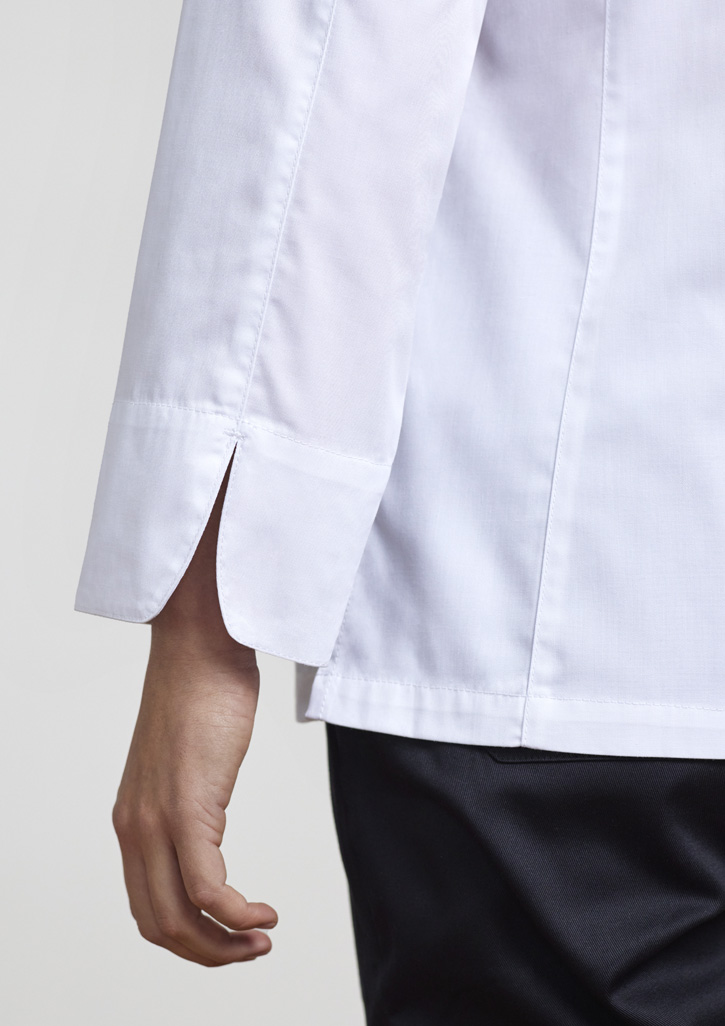 This garment has been made using recycled polyester resulting in the equivalent of up to 18 plastic bottles being diverted from landfill. Concealed zip front closure delivers a clean minimalist look. Lightweight twill cloth with underarm mesh ventilation keeps you cool where you need it most. Mandarin collar with apron tab to hold apron in place. 2 Sleeve thermometer/pen pockets. Long sleeve with side splits for ease. Long sleeve style features roll-up sleeve function with inside tab and button.